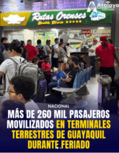 Durante el feriado de Independencia (8-12 de octubre), las terminales terrestres de Guayaquil movilizaron 260.894 pasajeros. 1 min read ECONOMIA ECUADOR Durante el feriado de Independencia (8-12 de octubre), las terminales terrestres de Guayaquil movilizaron 260.894 pasajeros. admin octubre 13, 2025 La Terminal Terrestre de Guayaquil (TTG) lideró con 230.602 viajeros y 2.500 frecuencias diarias, destacando destinos como...Read More
